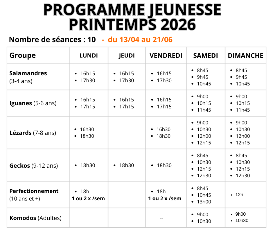 La durée de certains cours ainsi que les horaires, disponibilités, et tarifs ont été, dans certains cas, modifiés pour assurer une offre équilibrée et adaptée en prenant en compte les besoins de chaque groupe d’âge et notre nouvelle réalité d’organisation et de ressources. Nous vous invitons à en prendre connaissance lors de la consultation de l’horaire.